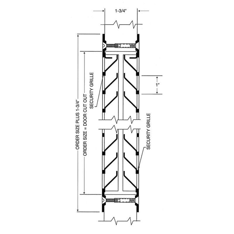 - Security grille is welded to the interior and exterior of louver with 13/16″ square openings 1″ on center, Thru-bolted to door