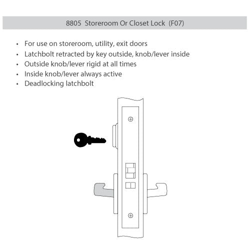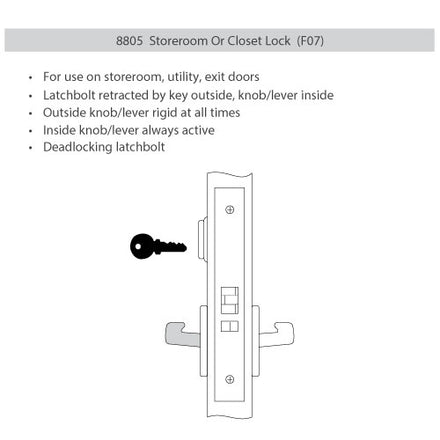 ANSI F07 – Storeroom – For use on storeroom, utility, exit doors. Latchbolt retracted by key outside lever inside. Outside lever rigid at all times. Inside lever always active. Deadlocking latchbolt.
