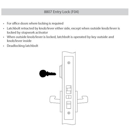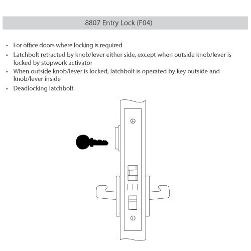 ANSI F04 – Entry – For office doors where locking is required. Latchbolt retracted by lever either side, except when outside lever is locked by stopwork activator. When outside lever is locked, latchbolt is operated by key outside and lever inside. Deadlocking latchbolt.