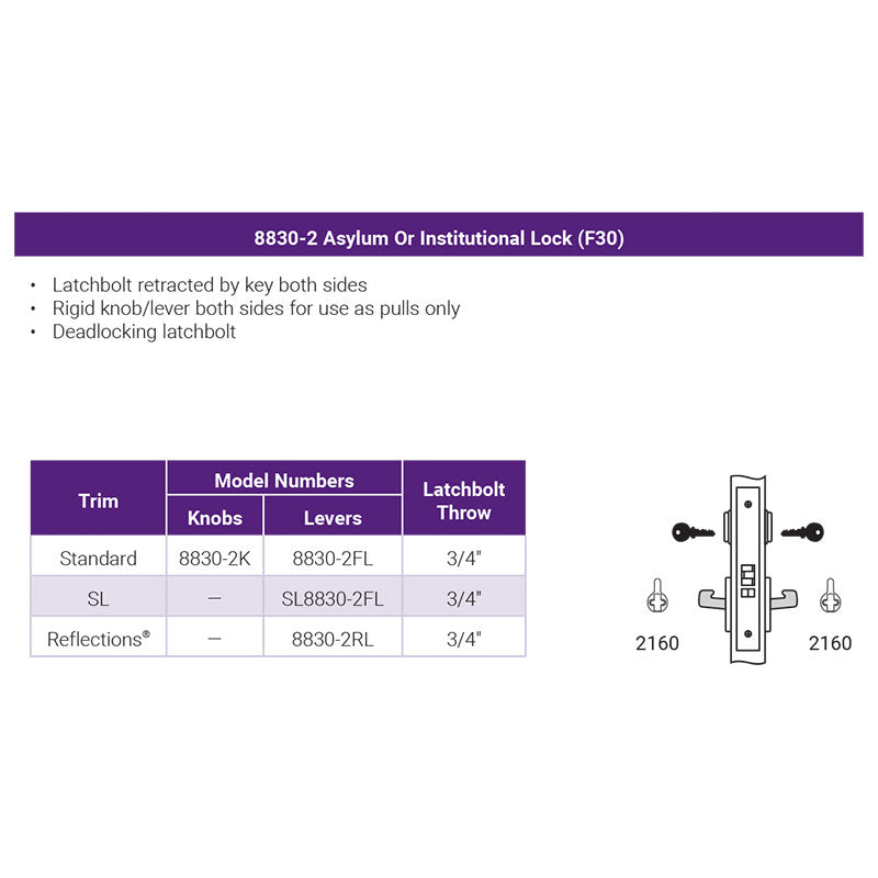 ANSI F30 – Asylum Or Institutional – Latchbolt retracted by key both sides. Rigid knob/lever both sides for use as pulls only. Deadlocking latchbolt.
