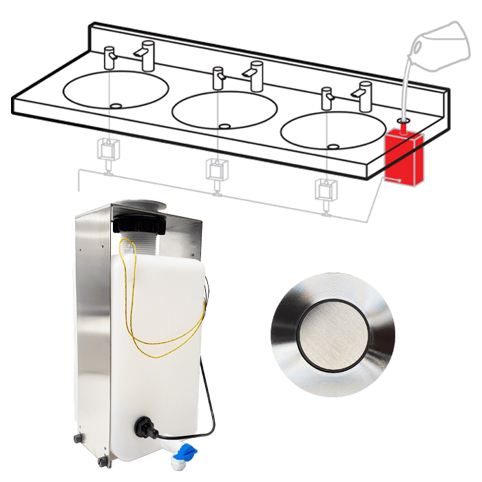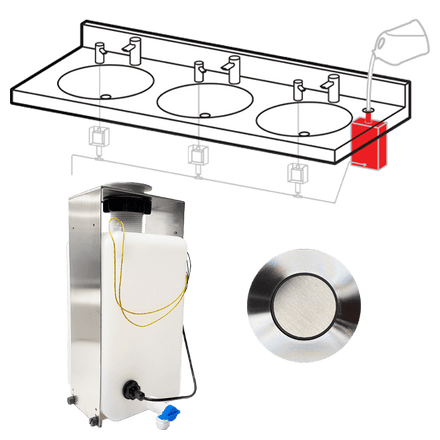 Save time and save your knees with ASI’s newest Top Fill Multi-Feed soap dispensing system. Fill up to 12 automatic liquid or foam soap dispensers with one pour using the counter fill port connected to a large capacity tank−a perfect addition to any high traffic washroom.