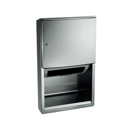 Fabricated of 22 gauge stainless steel with satin finish. Towels are dispensed one length at a time automatically when hands are placed in sensor zone until supply is depleted. Owner predetermines length of towel dispensed by making selections on three (3) three-position switches for length, delay, and economy. Unit may be reloaded with a full roll to automatically start when finished with an existing partial roll and will continue to feed properly when reloaded with a full roll and partial roll is transferred to stub roll position.