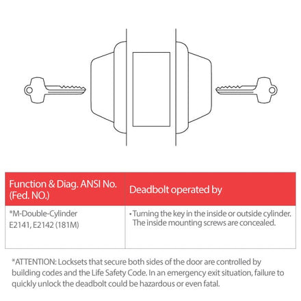 *ATTENTION: Locksets that secure both sides of the door are controlled by building codes and the Life Safety Code. In an emergency exit situation, failure to quickly unlock the deadbolt could be hazard ous or even fatal.