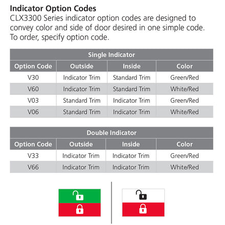 The CLX3300 Series cylindrical lock with status indicators, is the ultimate intersection of security and privacy. Engineered for easy installation in any space, it ensures instant visibility of the door's lock status. Featuring status indicator windows for optimal visibility. Built on the robust CLX3300 Series lock body, it exceeds Grade 1 standards, making it ideal for high-traffic restrooms, classrooms, or rooms requiring increased privacy.