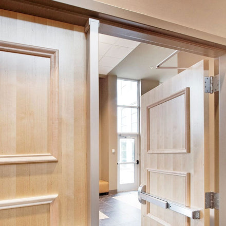 DORMA's removable mullions are used with paired doors when a full width opening is only occasionally required. Doors are fitted with rim exit devices and will function as single doors latching into mullion.