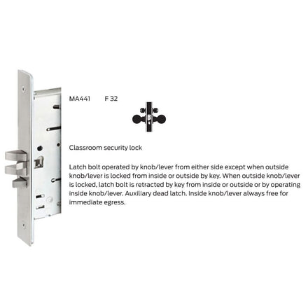 ANSI F32 – Classroom Security: Latch bolt operated by lever from either side except when outside lever is locked from inside or outside by key. When outside ever is locked, latch bolt is retracted by key from inside or outside or by operating inside nob/lever. Auxiliary deadlatch. Inside lever always free for immediate egress.