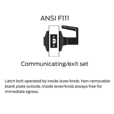ANSI Function F111 - Latch bolt operated by inside lever. Non-removable blank plate outside. Inside lever always free for immediate egress.
