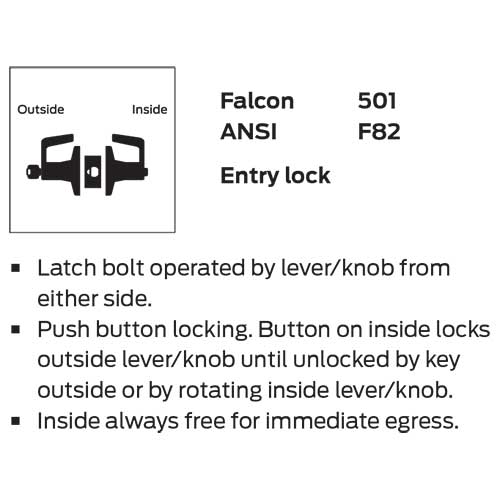 ANSI Function F82 – Latch bolt operated by lever/knob from either side. Push button locking. Button on inside locks outside lever/knob until unlocked by key outside or by rotating inside lever/knob. Inside always free for immediate egress.