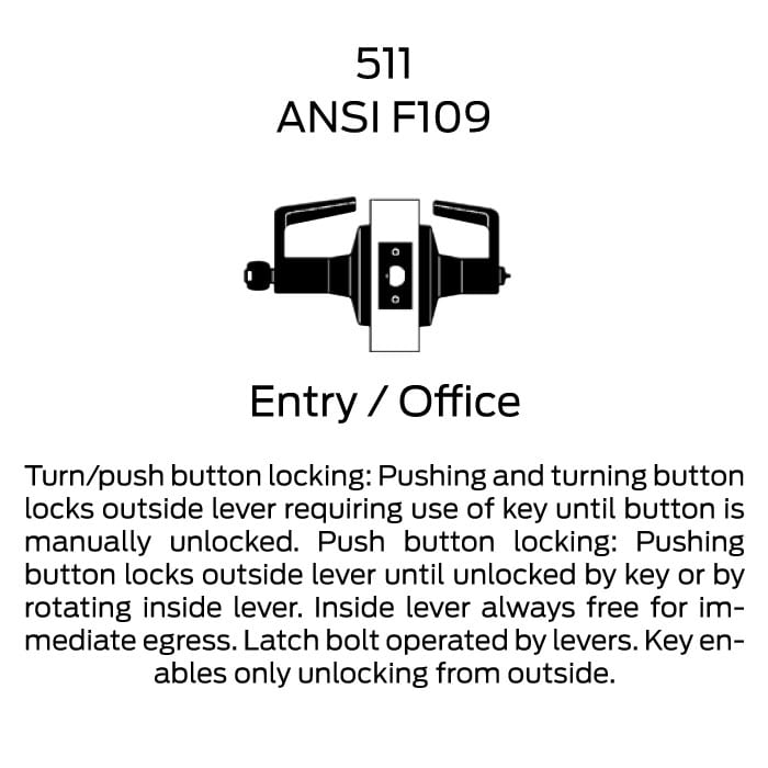 ANSI Function F109 - Deadlocking latch bolt by levers. Turn/push button locking. Pushing and turning button locks outside lever, requiring use of a key for unlocking the door until button is manually unlocked. Pushing button locks outside lever until unlocked by key or by rotating inside lever. Inside lever is always free.