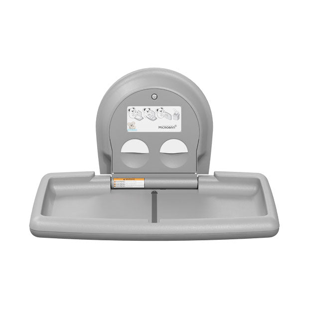 Surface-mounted, horizontal plastic baby changing station with stainless steel veneer is constructed of polypropylene and features a unibody steel chassis for superior strength. Available in two stunning colors with each providing a modern visual aesthetic. Thoughtful patron amenities enhance the end-user experience, and include Microban® product protection, a redesigned liner dispenser, a convenient external solid stainless steel rod bag hook with satin finish and the Koala brand mark that communicates comfort to families and the promise of a thoughtful accommodation.