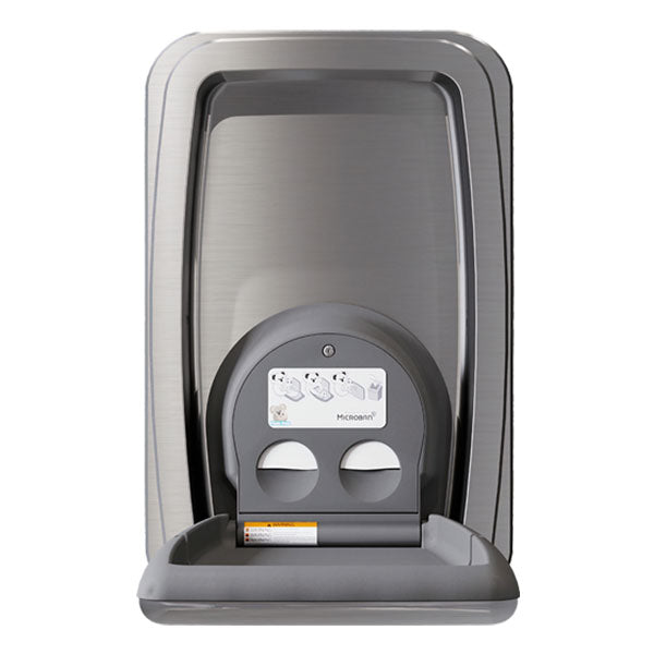 Surface-mounted vertical baby changing station that features one-piece, deep-drawn, uniform grain stainless steel exterior. This construction eliminates seams, sharp edges, and weld lines to form a modern aesthetic that helps upgrade the look of any washroom. Also available in a Black Matte finish (KB311-SSWM-MBLK).
