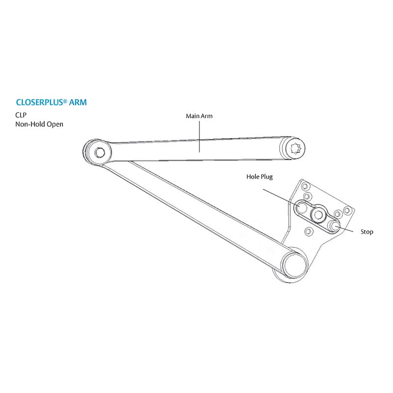 This arm incorporates a stop at the arm’s soffit plate to dead stop the door at a predetermined degree of door swing between 85° to 110°, in 5° increments. Prior to dead stop the door closer’s backcheck feature slows the door speed to reduce the impact of the stop action. The CloserPlus Arm is intended for use where an auxiliary door stop cannot be utilized and no more than moderate abuse is anticipated. Where more extreme conditions are expected, use of a Unitrol arm is recommended.