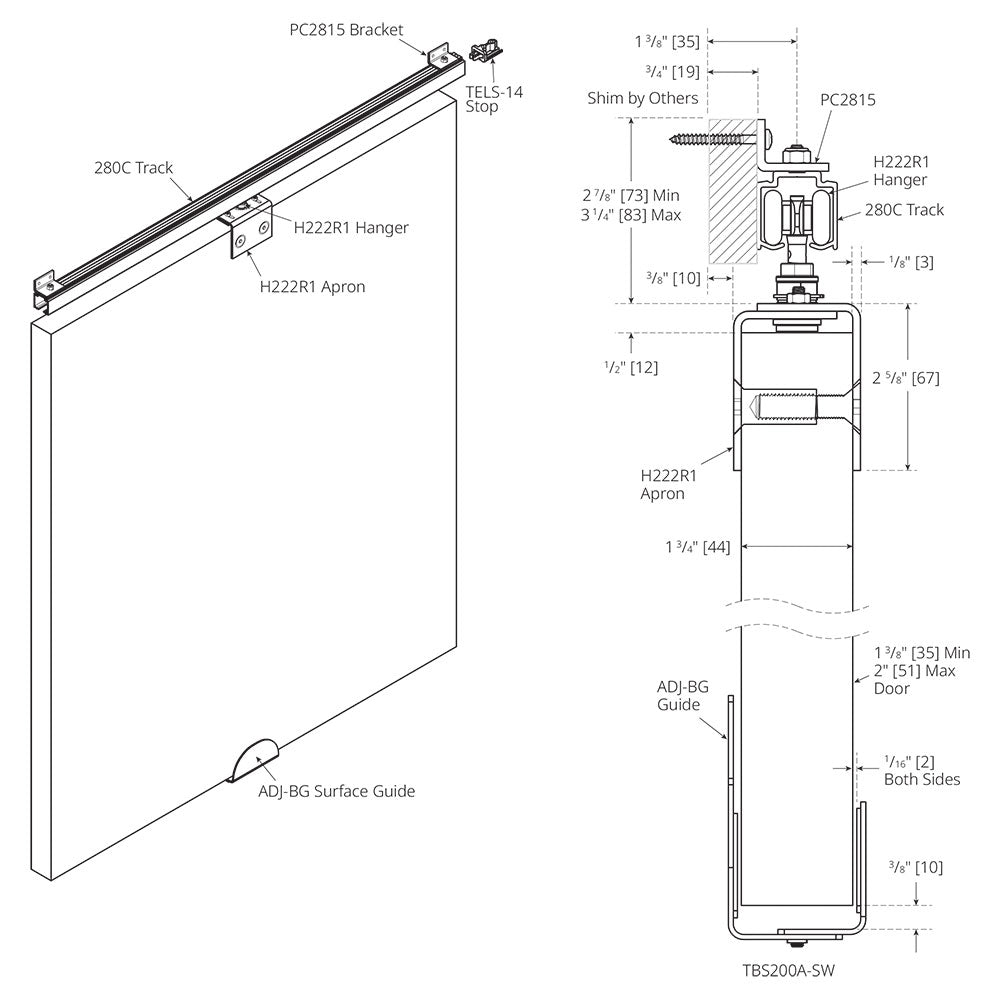 The TBS200A Series Through-Bolt Sliding Hardware System is designed for wood or hollow metal doors up to 200 pounds and can be overhead or side wall mounted with track lengths of 6, 8,10,12, and 16ft. It's an ideal solution when your door is made of alternative materials, including metal, fiberglass, and aluminum. This system, which is also suitable for wood doors, features an auto centering apron that equally distributes the weight of the door while the through-bolts negate the need for a substantial top rail.