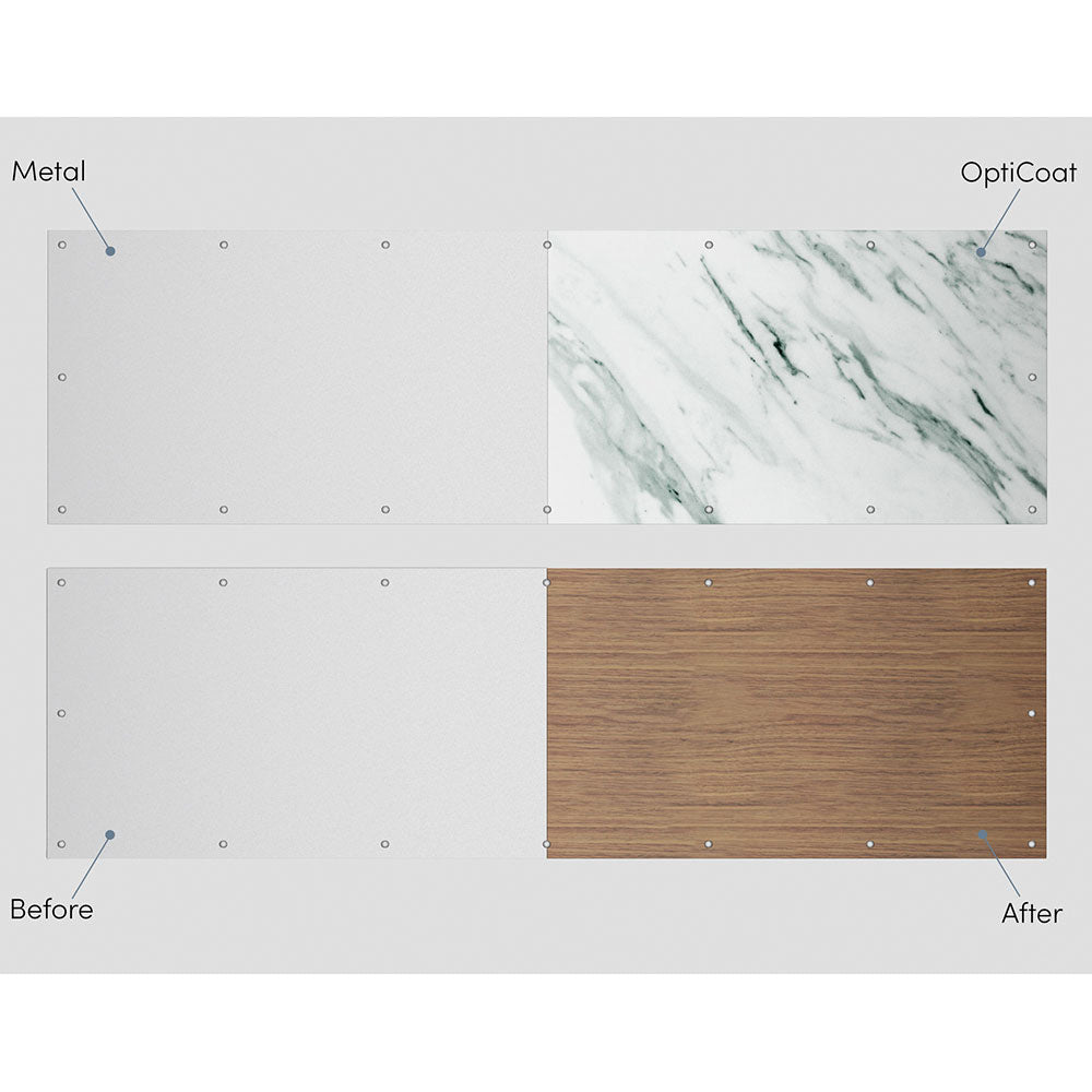 OptiCoat™ sublimation finish technology is revolutionizing aesthetics by transforming ordinary metals into stunning, high-end finishes that mimic the natural beauty of wood or marble. Through an advanced sublimation process, OptiCoat infuses realistic textures and patterns into metal surfaces, creating finishes that are not only visually striking but also incredibly durable.