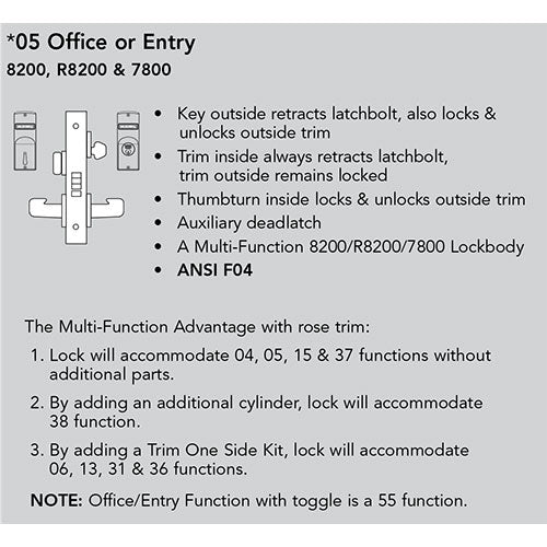 ANSI F04 – Office or Entry – Key outside retracts latchbolt, also locks & unlocks outside trim. Trim inside always retracts latchbolt, trim outside remains locked. Thumbturn inside locks & unlocks outside trim. Auxiliary deadlatch.