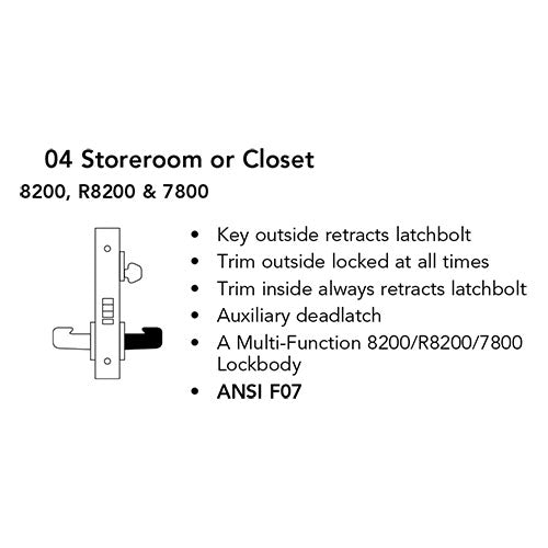 ANSI F07 – Storeroom or Closet – Key outside retracts latchbolt. Trim outside locked at all times. Trim inside always retracts latchbolt. Auxiliary deadlatch.