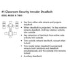 Classroom Security Intruder Deadbolt – Key from either side retracts and projects deadbolt. When deadbolt is projected, 1st key rotation retracts deadbolt, 2nd key rotation unlocks trim outside. Key retraction of latchbolt from either side unlocks trim outside. Trim outside retracts latchbolt, except when locked. Trim inside (when deadbolt is projected) retracts both latchbolt and deadbolt simultaneously and the outside trim remains locked. Auxiliary deadlatch.
