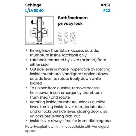 ANSI F22 - Privacy - Latchbolt retracted by lever from either side unless outside is locked by inside thumbturn. Turning inside lever or closing door unlocks outside lever. To unlock from outside remove emergency button, insert emergency thumbturn (furnished) in access hole and rotate. Inside lever is always free for immediate egress.