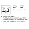ANSI Function F82 – Push-button locking. Push-button locks outside lever until it is unlocked with key or by turning inside lever. Inside lever always free for immediate egress.