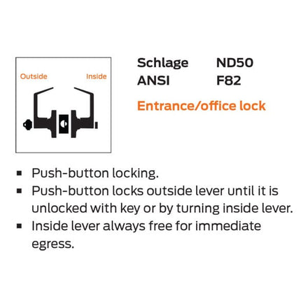 The ND Series is ANSI/BHMA Grade 1 certified and performs beyond the Grade 1 standards. The Schlage ND is regularly used in healthcare, education, government, office, retail, and other commercial applications.