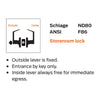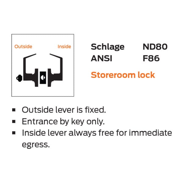 ANSI Function F86 – Outside lever is always locked; Entrance by key only – Inside lever is always unlocked