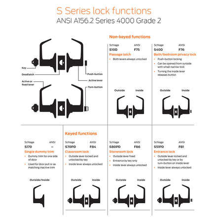 S Series are interior-use, Grade 2 locks featuring both keyed and non-keyed functions. They are ideal for light commercial applications like small hotels and office tenant space, as well as apartment buildings. Heat treated locking components add strength while Schlage solid levers in plated zinc are engineered for long life and optimum durability.