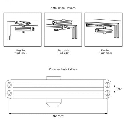 - Mounting: Regular, Top Jamb & Parallel Arm (includes PA bracket)