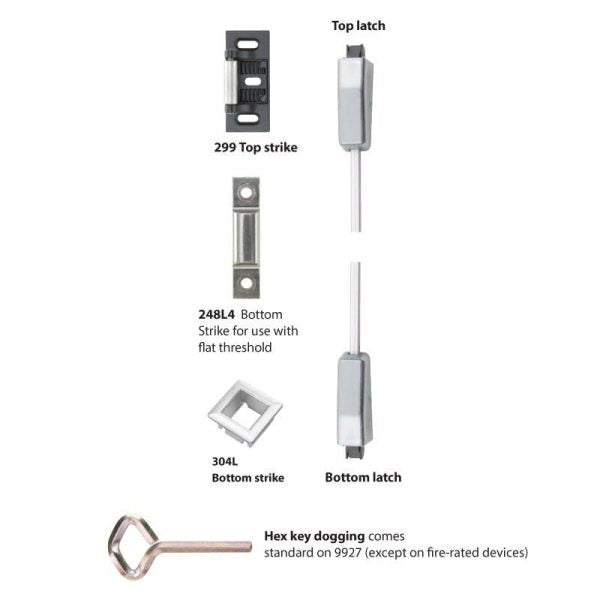 The 9927 Series has been certified to the highest industry standards and are used in schools, hospitals and government buildings. 9927 Surface mounted vertical rod device for all types of single or double doors, UL listed for panic exit hardware. Devices are ANSI A156.3 – 2014 Grade 1. Covers stock hollow metal doors with 86 or 161 cutouts. The 9927-F model is fire-rated for pairs of doors up to 8′ x 10′ – UL listed for fire exit hardware.