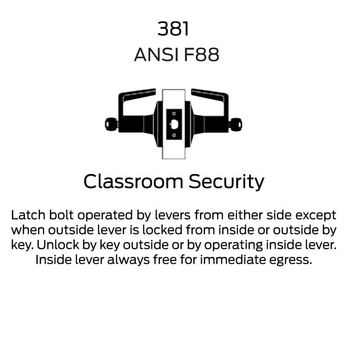 ANSI Function F88 – Latch bolt operated by levers from either side except when outside lever is locked from inside or outside by key. Unlock by key outside or by operating inside lever. Inside lever always free for immediate egress.