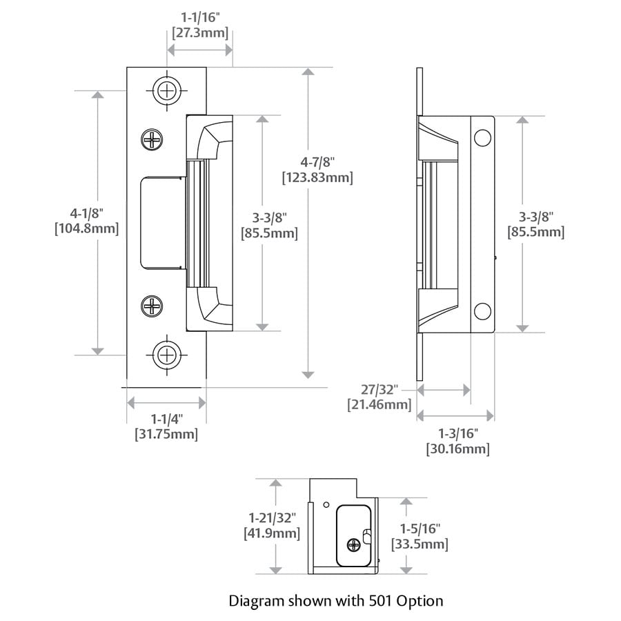 - Includes 5200 strike body, 501 faceplate for cylindrical locksets in ANSI metal jambs and 501A faceplate for cylindrical locksets or spring latches in aluminum frames.
