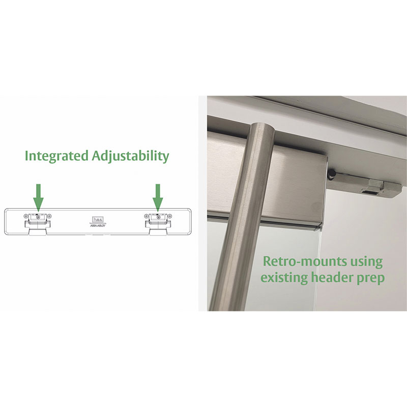 Retro-mounted electric strike with integrated adjustability and field installable options for maximized versatility on double glass doors.