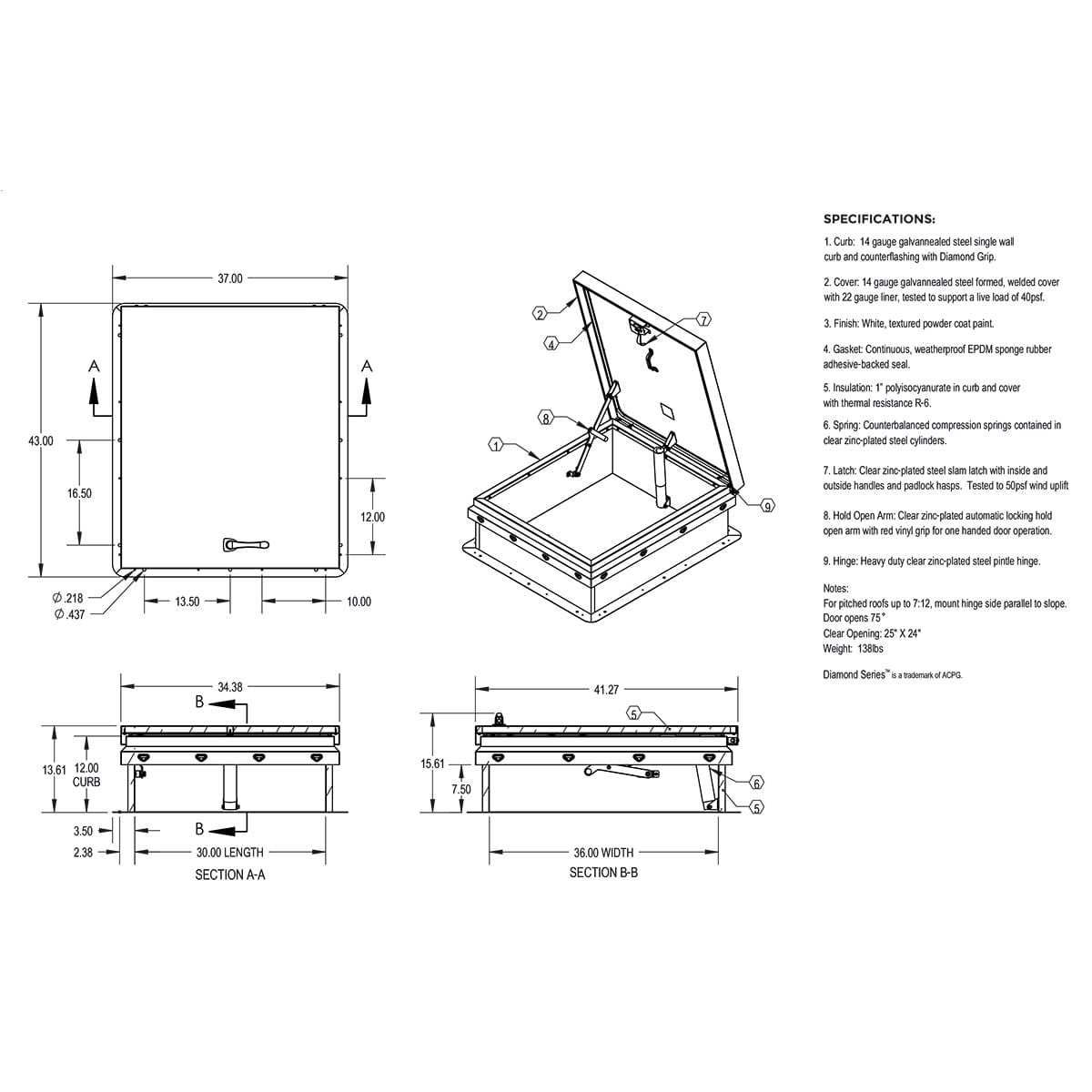 JL Industries RHDG-1WT 30″ x 36″ Diamond Series Steel Roof Hatch, Ladder Access