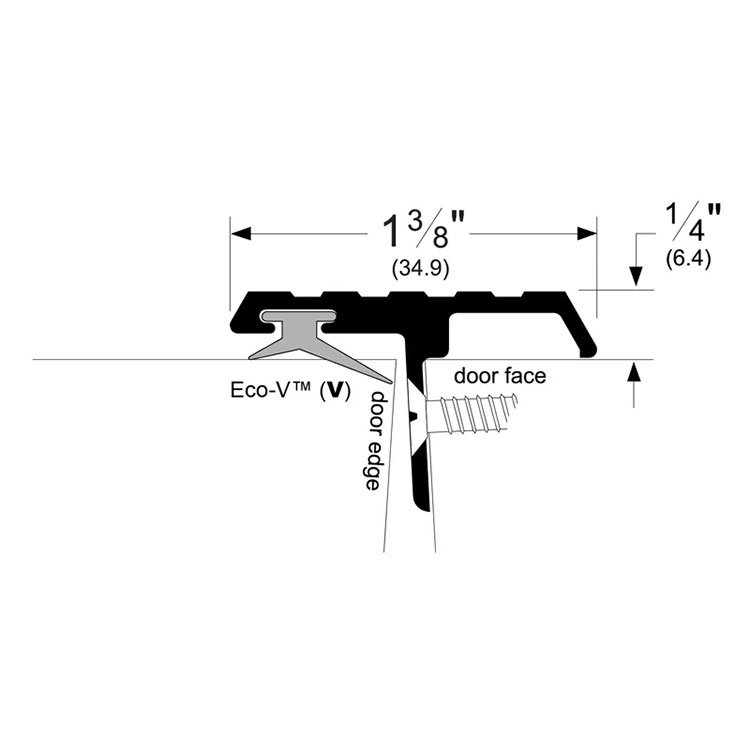 The 355_V is a surface-mounted, T-shaped Astragal designed for single active double doors with an Eco-V (V) insert. It effectively seals the gap between the doors, preventing infiltration of smoke, sound, light, drafts, and insects. Made with a high-quality clear anodized aluminum casing, this astragal is durable and resistant to extreme environments.