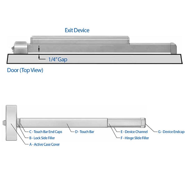 - Touchbar Clearance – Can accommodate doors with vision lites or where the lite frames or moldings project up to 1/4 beyond the face of the door