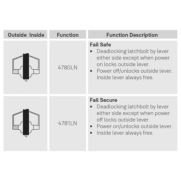 Fail Secure - Deadlocking latchbolt by lever either side except when power off locks outside lever. Power on/unlocks outside lever. Inside lever always free.