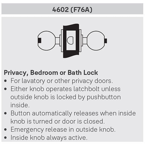 ANSI Function F76A - Keyless - For lavatory or other privacy doors. Either knob operates latchbolt unless outside knob is locked by pushbutton inside. Button automatically releases when inside knob is turned or door is closed. Emergency release in outside knob. Inside knob always active.