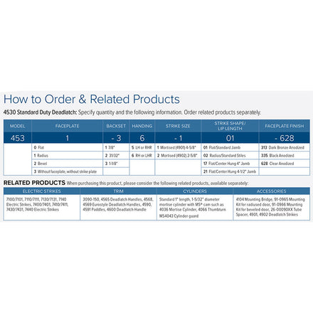 4530 Standard Duty Deadlatches provide flexible traffic control during and after business hours. Designed to retrofit into the prep of older MS1850 Deadlocks and discontinued 4250 Deadlatches.