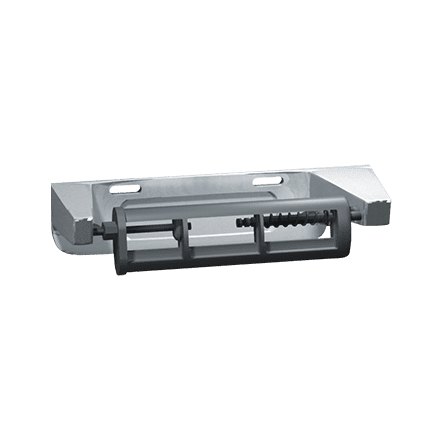 Single roll toilet tissue dispenser with controlled-delivery spindle. Holds and dispenses all standard core roll tissue up to 6″ (152 mm) diameter. Fabricated of heavy-duty aluminum casting with satin-matte, silver-grey powder coated finish.