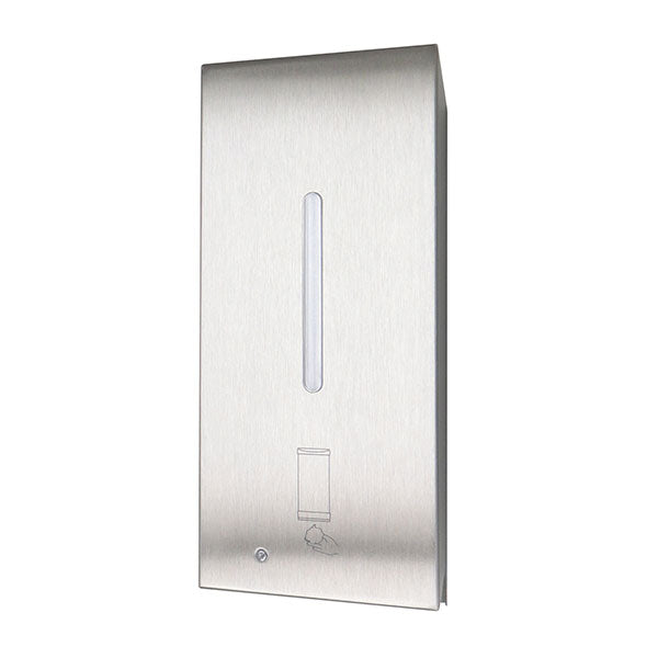 Automatic wall-mounted soap dispenser shall be Type-304 stainless steel with satin finish. Corrosion-resistant valve shall dispense a variety of foam soaps, iodine-based foam soaps, and alcohol-based foam hand sanitizers. Note foam quality may vary when used with foam hand sanitizer. Valve shall be sensor-activated and not require contact with the dispenser to function. Lockable housing shall be equipped with a clear acrylic refill-indicator window and be hinged for refilling and maintenance. Container shall have a capacity of 800 ml (27-fl oz). Unit shall have CE Certification.