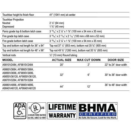 - UL and ULC Listed - 9860 Series for panic. F9860 Series for fire exit hardware for all types of 8’ x 8’ double doors for up to 3-hour fire labeled installations. Conforms to standards UL10C and UBC 7-2-1997 codes