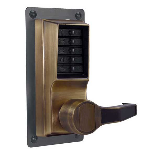 Mechanical pushbutton lock eliminates problems and costs associated with issuing, controlling, and collecting keys and cards. Provides exterior access by combination, while allowing free egress with Exit Device (not supplied).