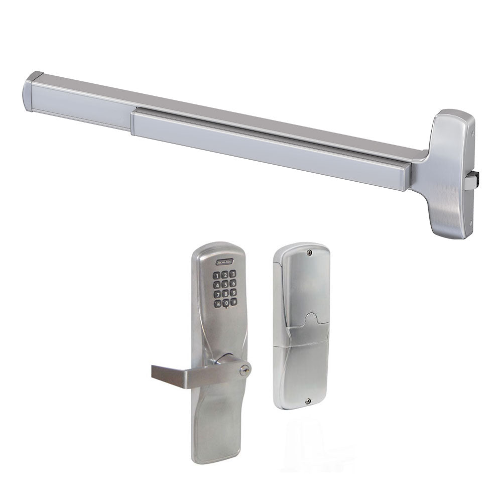 Falcon 25-R Series panic rim exit device with keypad lever trim is for use with single doors and double doors with a mullion.