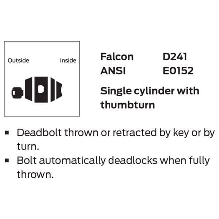 Deadbolt locks provide an extra measure of protection against break-in when used as a supplement to an existing lockset. In applications ranging from military and government projects to multi-family housing, retail, and restaurants, Falcon deadbolts deliver superior performance. The D241 will fit on virtually any door due to an innovative, adjustable backset design; and they’re backed by Allegion, the best name in the business. Falcon continues to deliver a solid product at a solid price.