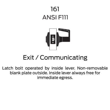 ANSI Function F111 - Latch bolt operated by inside lever. Non-removable blank plate outside. Inside lever always free for immediate egress.