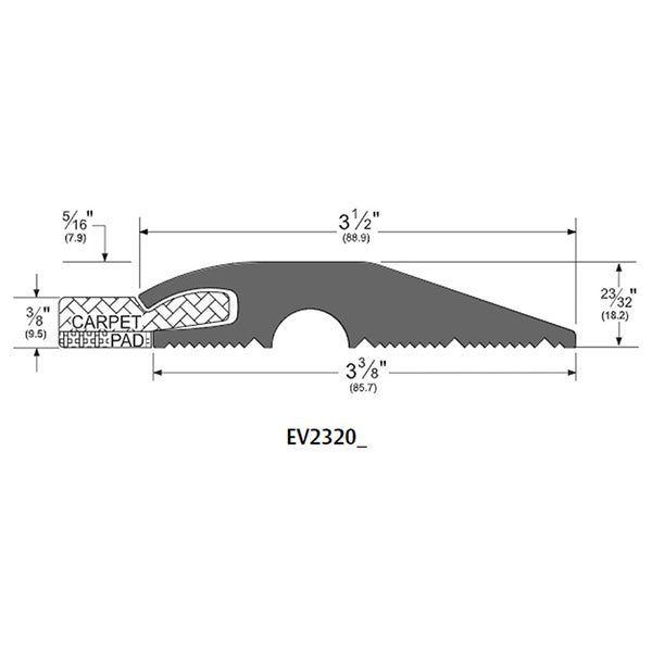 The EV2320 3.375" wide and .72" high Eco-V Threshold is designed for easy transitions between carpet and concrete. Made with bio-based, phthalate-free Eco-V material, it is environmentally friendly and has achieved GREENGUARD GOLD Certification. This threshold is perfect for high-traffic commercial areas like hotels and offices. Available in various lengths, it is fire rated and manufactured with slightly softer material for easy cutting and fitting. The black finish adds a sleek and modern touch to any doorway.