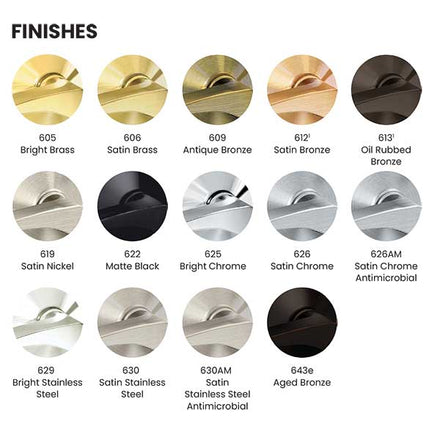 626 Satin Chrome, 605 Bright Brass, 606 Satin Brass, 622 Matte Black, 612 Satin Bronze, 613 Oil Rubbed Bronze, 625 Bright Chrome, 630 Satin Stainless Steel, 643e Aged Bronze, 619 Satin Nickel, 629 Bright Stainless Steel |