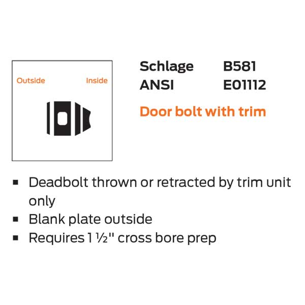 ANSI Function E01112: Deadbolt thrown or retracted by trim unit only. Blank plate outside. Requires 1 ½" cross bore prep.