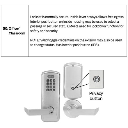 Office/Classroom Function (50): Lockset is normally secure. Inside lever always allows free egress. Interior pushbutton on inside housing may be used to select a passage or secured status. Meets need for lockdown function for safety and security. NOTE: Valid toggle credentials on the exterior may also be used to change status. Has interior pushbutton (IPB).