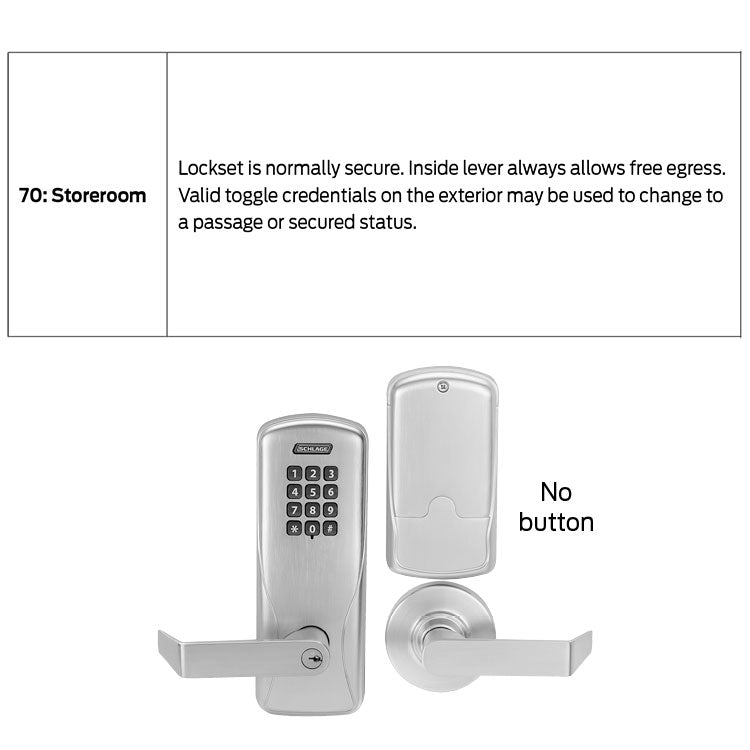 Storeroom Function (70): Lockset is normally secure. Inside lever always allows free egress. Valid toggle credentials on the exterior may be used to change to a passage or secured status.