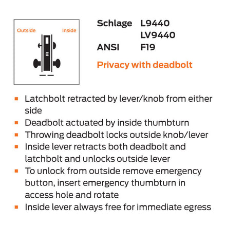 ANSI Function F19 - Privacy with Deadbolt – Latchbolt retracted by lever/knob from either side. Deadbolt actuated by inside thumbturn. Throwing deadbolt locks outside knob/lever. Inside lever retracts both deadbolt and latchbolt and unlocks outside lever. To unlock from outside remove emergency button, insert emergency thumbturn in access hole and rotate. Inside lever always free for immediate egress